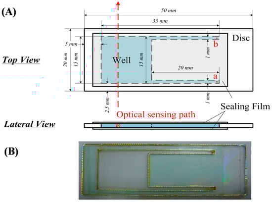 To achieve the high temperature and alkaline conditions required for the DNS coloration reaction, the disposable strip was supported by a polycarbonate (PC) plate, because this has good chemical/heat resistance and visible-light transmittance. The polycarbonate plate was cut from a compact disc (thickness 1.20 mm) with a laser cutting machine (cutting rate: 1500 mm min−1; power: 40 W) into suitable schematic diagrams, shown in detail in Figure 2. The protective/reflective layer was then removed by tape. The upper and lower sides of transparent specimen were sealed with heat-resistant sealing film (UC-500, Axygen Bioscience, Inc., Union, CA, USA) to fabricate the homemade disposable strip, and the upper sealing film was punched with a syringe needle to form two pinholes at the terminal end of narrow channels to form the solution injection and gas exhaust sites. The spatial configuration of narrow channels and pinholes efficiently reduced the measurement error by removing from the solution the small bubbles that were produced from the DNS coloration at high temperatures or mixing procedures. To remove the bubbles, small vibrations were generated to push them into narrow channels and exhaust them via pinholes. Therefore, the absorbance of mixtures was monitored in real time with the optoelectronic platform through the cut surface of the disposable strip. The red dashed line in Figure 2A depicts the optical sensing path. The sealed structural design of this disposable strip improved the measurement repeatability by lowering the sample evaporation. The disposable strip had a transparency of about 20% (CV < 10%, n = 8), and required a total reagent volume of only 200 μL to decrease the sample usage and heating time (4 min, from 20 °C to 80 °C).