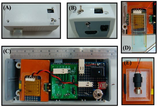 The prototype of hand-held photometer. (A,B) Outward of hand-held photometer and its side view, respectively. (C,D) The inside view of the hand-held photometer and a zoom-in view of disposable strip with polyester heater, respectively. (E) The zoom-in view of vibrator which adhesive on the back of bakelite plate.