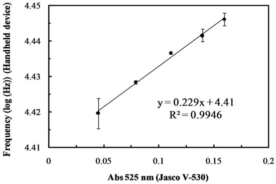 To improve the reproducibility, convenience, and cost in analytical applications, many portable optical-sensing instruments have been developed for process the monitoring and medical diagnosis fields, because they can be operated by lay people, and their results are obtained in the field and within a good time frame [28,29,30,31,32]. These hand-held colorimetric devices are generally miniaturized with light-emitting diodes (LEDs) as quasimonochromatic light sources for sensor-exciting and solid-state photodiodes for absorbance measurements. With appropriate bias and support circuits, the low-energy consumption, stability, and sensitivity of these optoelectronic devices have been shown to have the desired analytical performance, including accuracy.