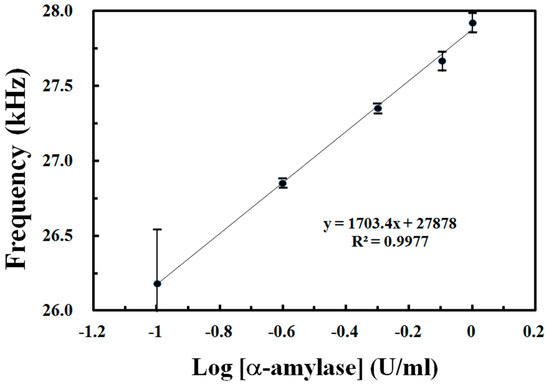 Figure 5 plots the frequency output of the photodetector for the absorbance response of DNS reagents to various concentrations of α-amylase. The linear detection range of the hand-held photometer for α-amylase activity is 0.1–1.0 U mL−1, and the response reaches saturation when the α-amylase activity reaches 2.0 U mL−1 (not shown here). The calibration curve is linear to α-amylase activity because it is located in the low activity range. The achieved detection limit and sensitivity values were 0.1 U mL−1 and 1703.4 Hz (log U mL−1)−1, respectively. The resolution of the proposed system with DNS reagent for α-amylase is as low as 5.9 × 10−4 log U ml−1, given a 1 Hz precision of the instrument adopted with the UFDC module. As shown in Table 1, the proposed α-amylase meter performs with an excellent sensitivity and good sample volume requirement, as well as a slightly better detection range than an iodine-based colorimetry [19]. Despite the meter’s detection range being lower than some electrochemical methods [11,16,17], its excellent sensitivity will overcome this weakness when it used in higher concentration conditions by dilution processes. The linear detection range of this prototype for α-amylase activity was below the diurnal range of sAA activity (10–300 U ml−1), but is still usable to quantitatively determine sAA levels in a sample to within the predetermined linear α-amylase activity range (0.1–1 U ml−1).