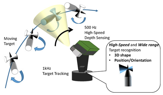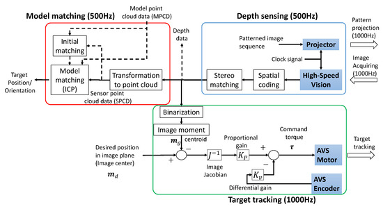 A flowchart of the processing of the entire system is shown in Figure 4. It consists of three parts: high-speed depth image sensing, target tracking, and model matching. The system tracks a fast moving object by visual servoing, and a depth image is generated at 500 Hz while controlling the direction of the visual axis of the camera. Next, the generated image is converted to point cloud data, model matching is performed with a reference model, and the position and orientation of the target are detected at 500 Hz. A detailed explanation of each step is given in the next section.