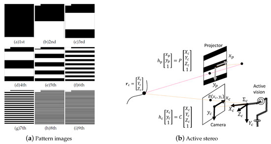 In this system, we adopt the spatially coded pattern method [1] and a Gray-code pattern [32]. The reason for using a Gray-code pattern is that the code error decreases because the Hamming distance with a Gray-code is only one. When the spatial code is n bits, and the k-th projected binary image , , has a spatial resolution of pixels, can be expressed by the following equation: