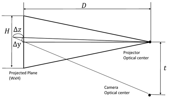 Let us now analyze the relationship between measurement accuracy and target speed. The geometrical relationship in the active stereo vision is actually described by Equation (4). However, in order to simplify the problem, consider a simplified model shown in Figure 6, where it is assumed that the target is on a plane and the size of the projected plane is , the distance between the plane and the optical center is D, the distance between the projector and the camera is t, and shows the number of the projected patterns.