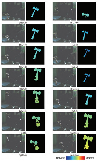 For comparison, Figure 11 shows the depth map when target tracking was not performed. It can be seen that the grip of the ken disappeared when it was swung largely in the lateral direction. This is probably because the 3-D measurement did not catch up with the moving speed of the ken. On the other hand, when tracking was performed, such disappearance did not occur. This is probably because the relative target movement speed was reduced by target tracking.