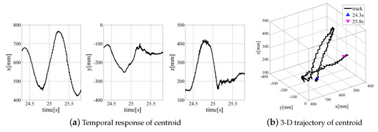 The trajectory of the centroid in Figure 10 was calculated offline by using the same model matching method. This is just to show the movement of the target for reference. Considering the size of the ken in the image and the trajectory, a wider 3-D measurement range could be achieved by tracking the target instead of fixing the high-speed 3-D sensor.