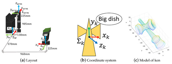 An experiment for the model matching was conducted using the ken. It was attached to a 7-DOF robot manipulator, and the true values of its position and orientation were calculated from the joint angles of the manipulator. These were compared with the values measured with the high-speed depth image sensor. The coordinate system fixed to the ken is shown in Figure 12a. Figure 12b shows the experimental setup of the manipulator and the high-speed depth image sensor. Figure 12c shows the M-PCD of the ken. The motion of the manipulator was such that it rotated about rad around the Z axis, rad around the Y axis, and around the Z axis during about 2 s. In this trajectory, the maximum speed of the ken was about 1 m/s.