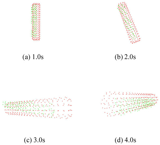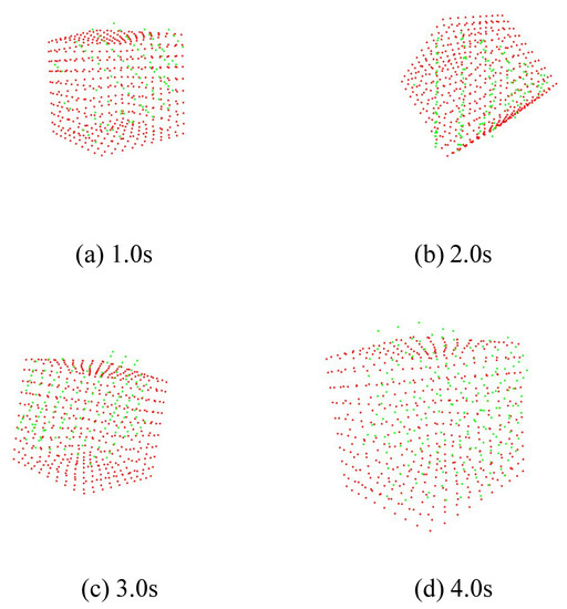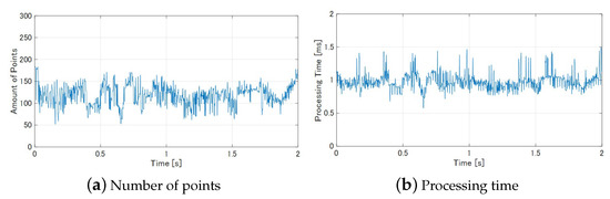Figure 13a shows the temporal change of the number points in in S-PCD. It was adjusted depending on the parameter , and it is shown that it was kept between 50 and 200 points.