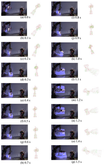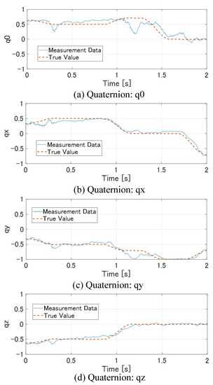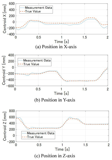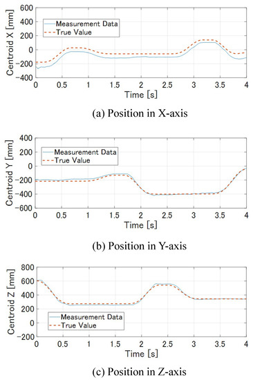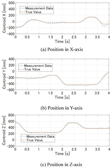 Figure 14 shows how the M-PCD and the S-PCD match. It can be seen that the M-PCD followed the motion of the ken. Figure 15 and Figure 16 show the centroid and the orientation measured by the high-speed depth sensor and their true values calculated from the manipulator, respectively, in world coordinates. It is shown that there were no large errors in these measurements. It was difficult to distinguish between a large plate and a small plate in the ken, and it was reversed 180 degrees around the Y-axis sometimes. However, in most cases, the model matching was successful.