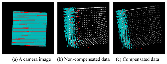 We conducted an experiment to verify the effect of the correction described in Section 4.4. Figure 21 (a) shows a camera image, (b) shows the point cloud before the correction, and (c) shows the point cloud after the correction. The blue points represent the observation point cloud, and the red points represent the points to be corrected.