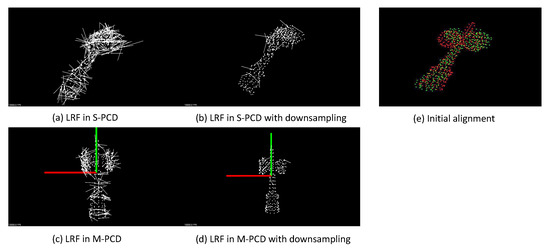 In Figure 22a–d, the examples of LRFs are shown. Figure 22a shows the LRFs of the S-PCD, and Figure 22b shows the down-sampled LRFs, down-sampled to . Figure 22c,d are the original LRFs and the downsampled LRFs of the M-PCD. Figure 22e shows an example of the initial alignment. It can be seen that the M-PCD is roughly matched with the S-PCD.
