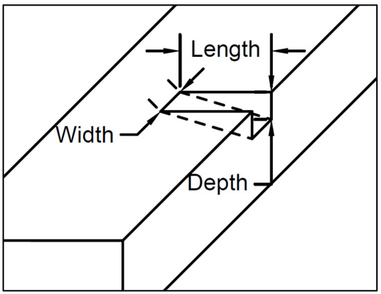 UHPC is a heterogeneous, cementitious composite material, with discontinuous fiber reinforcement, and a discontinuous pore structure [5]. With these voids and reinforcements present, almost at random, the inner structure of this material can be less predictable than RC. Voids can appear within the first mm of the surface and the same goes for the reinforcement. For more realistic damage detection, a new index based on loss of volume was used. Usually, for visual inspection, especially for RC, cracks are measured in length and width [17]. However, to get a more complete idea of the crack, we also measured the depth. Using a right triangular prism shape, the crack was idealized and able to be easily measured. Using the length, width, and depth of the crack, the volume index was obtained. This is shown in Figure 1.