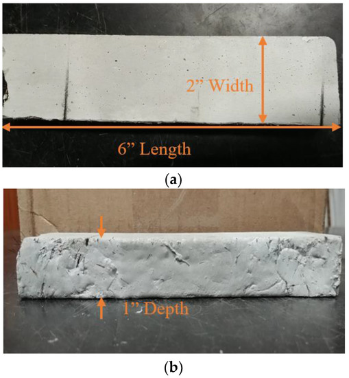 Two UHPC specimens were fabricated for the experimental validations, UHPC with metal fibers (UHPC-A) and UHPC without metal fibers (UHPC-B). Both specimens have the same constitution and dimensions. The dimensions of the fabricated UHPC specimens are 1 inch (2.54 cm) in depth, 2 inches (5.08 cm) in width, and 6 inches (15.24 cm) in length, as shown in Figure 2. The multiple cracks shown in Figure 2a are from the multiple tests done on each sample for this paper. UHPC-B has multiple cracks as well. The crack dimensions were different to ensure the range of the RFID tag. In Figure 2b, the metal fiber reinforcement is shown protruding from the sample.
