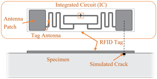 The commercial UHF RFID tag used in this research was the Alien Technology ALN-9662 Short Inlay tag [27], as shown in Figure 3. This tag is EPG Gen 2 and ISO/IEC 18000-6C compliant and it uses a Higgs 3 EPC Class 1 Gen2 RFID tag integrated circuit (IC). The tag antenna is made of a flexible metallic material, which is adhered to a wet inlay. The cost for each dipole tag is about $0.10 for mass production. The antenna sensors can be fabricated on inexpensive substrate materials, such as paper, PVC (polyvinyl chloride), using low-cost fabrication techniques, such as inkjet printing [7]. This commercial tag is 70 mm long and uses a Higgs 3 EPC Class 1 Gen2 RFID tag integrated circuit (IC). Figure 3 shows a detailed view of the IC and the tag mounted on the specimen. As shown, the antenna patch is oriented across the crack for test replicability and crack sensitivity uniformity. While this testing places the patch directly over the crack for test replicability and to ensure best possible crack sensitivity, the tag can still sense cracks not in that location as proved by Martinez-Castro. In addition, different than the previous study of crack detection on metallic surfaces by Martinez-Castro et al. [28], the substrate between the tag and the specimen was removed. Therefore, direct tag attachment is feasible for crack detection on cementitious materials.