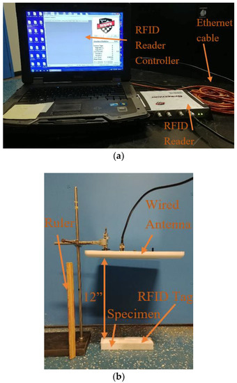 Lab-based system crack detection setup, (a) RFID controller and reader; (b) RFID specimen, tag and antenna.
