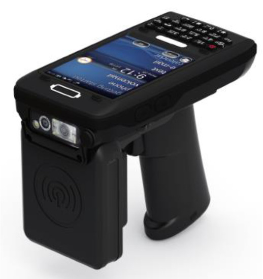 To improve mobility for field damage identification, another RFID reader with handheld functionality, i.e., ‘handheld system’, was employed. The handheld system used ATID AT870N PC equipped with a windows embedded mobile (see Figure 5). This PC had a UHF module read/write RFID tag with a performance frequency of CE 850–968 MHz; 902–928 MHz are the frequencies used for North America. Using the Alien Handheld RFID reader app, the mean RSSI could be determined by a 1 Hz visual recording method, as the reader did not output a data file. The collected RSSI measurements were then averaged to create the mean RSSI. This system’s applicability was also tested as it was not tested in previous research [14]. With acceptable performance that could overcome the difficulty in maintaining constant read distances, this system could be implemented in the field. This method will be referred to as the “handheld system” because of its mobility and field applicability. When compared to the lab-based system, the handheld’s ease of use is much higher. Without the need of any cables or a power source, because of being battery powered, if fully implemented, this crack monitoring system using the handheld reader would be superior.