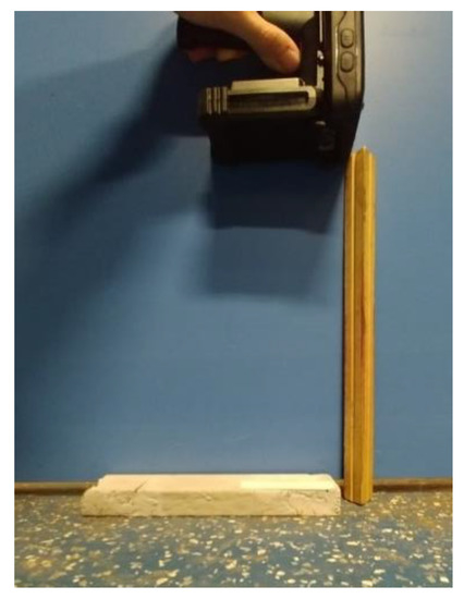 The front attachment of the mobile PC is the UHF reader, shown in Figure 5. When the search for the RFID signal was initiated, the mean RSSI appeared on the screen along with the tag’s unique ID. Figure 6 shows the data collection setup for the handheld system with a read distance of 1 foot, which will be used for all handheld collection.
