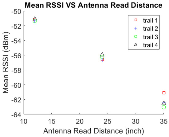 In a previous test the read distance of 35 inches (88.9 cm) was used. This was only for one test to confirm preliminary read-distance tests from the previous publication [14]. The previous publication also confirmed the accuracy and usability of this setup. The setup was slightly varied for the other, smaller, read distances.