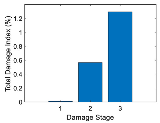 Figure 10 displays the positive trend of the total damage index while the damage stage increased. This was the same trend that Test 2, with the lab-based system, found. However, the handheld test showed larger values for the total damage index. This could be because the non-uniformity of the UHPC material affected the readings differently with every crack. It could also be due to the handheld antenna having a higher power than the lab-based system, due to the lower strength signal sent or the wider range of data collection locations this system was designed for. The scale of these values is no more than double that of Test 2a. The tag, when used in a different location with data collected from a different reader, still performed as intended. As the crack volume increased, so did the total damage index.