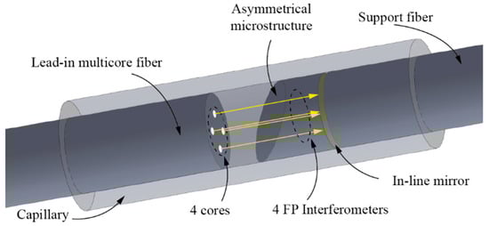 The proposed sensor assembly is presented in Figure 1, and consists of a lead-in four core fiber, an asymmetrical microstructure positioned in front of the lead-in four core fiber, an in-line semi- reflective mirror and a support fiber, all packed in a thick wall glass capillary. The asymmetrical microstructure comprises of a short section of a coreless fiber, which is polished at an angle on one side, and spliced to the in-line fiber mirror and the support fiber on the other. The length of the support fiber is arbitrary, and serves primarily as a fastening element for attaching the sensor assembly to the measured object. The cores of the four core fiber are positioned tetragonally within a fiber cross-section plane, with distances between diagonally positioned cores of 70.7 μm (Figure 2a). The sensor assembly thus defines four FP interferometers, which are formed by the perpendicularly cleaved end of the lead-in four core fiber and the in-line fiber mirror, positioned between the asymmetrical microstructure and the support fiber. The optical path length of each FP interferometer is comprised of two paths: A path in the air and a path in the glass. The lengths of those two paths are, however, different for each individual interferometer, and, further, depend on the rotational alignment between the lead in four core fiber and asymmetrical microstructure, as shown in Figure 1. The angular displacement between lead-in fiber and support fiber, (which is permanently attached to the asymmetrical microstructure), thus modulates the total path lengths of all four interferometers in distinctive ways, as explained further below.