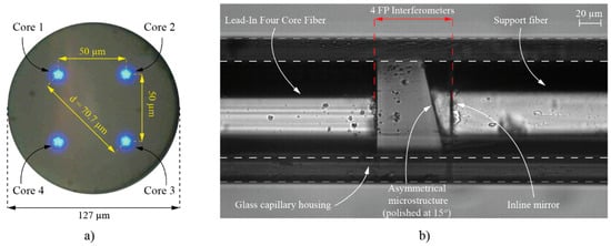 The asymmetrical microstructure and the supporting fiber were fabricated from a coreless fiber. The sensor housing was made of a thick wall glass capillary with an inner diameter of 127.5 μm and outer diameter of 180 μm. The sensor production started by chemical etching of the coreless fiber with an initial diameter of 140 μm to a diameter of 127 μm, which corresponded closely (within tolerance better than a μm) to the measured diameter of the in-line four core fiber. To maximize the interferometer’s fringe visibility, the reflectance of the in-line mirror was adjusted to approximately 15%. This value was determined heuristically, and depended on signal loss caused by beam divergence within the open-path FP-cavity, and Fresnel loss, instigated by light passing through a tilted surface (asymmetrical microstructure) having different refractive indices (the tilted surface deflects the incoming and back reflected beam from the senor assembly axis, but within given geometrical parameters and beam divergence at the output of the four core fiber, reasonably good interference fringes were obtained for all interferometers). The in-line mirror was generated by sputtering a multi-layer film of TiO2 and SiO2 on the cleaved tip of a coreless fiber, which was then spliced to the support fiber by a fusion splicer by an appropriate splicing procedure to yield the preferred reflectivity [42]. The next manufacturing step included cleaving of the coreless fiber on one end, around 50 μm from the in-line mirror, and polishing it at an angle of approximately 15°, thus finalizing the fabrication of the asymmetrical microstructure. To achieve a respectable compromise between mitigating the sensors’ temperature influence on elongation (strain) measurements and the capability to measure temperature, the length of the asymmetrical microstructure was a few µm long [39,43]. Therefore, the angle polishing process ended when the shorter side of the asymmetrical microstructure was in the vicinity of the in-line mirror (Figure 2b). The final step included fitting the in-line four core fiber and the asymmetrical microstructure into the thick wall glass capillary housing. To assure proper fixation of the thick glass capillary housing, we attached it firmly to the lead-in four core fiber with a high Young modulus epoxy glue, to prevent any torsional creep of the fiber. The inner wall of the glass capillary was smooth and without irregularities in the change of the inner diameter, so it did not cause noticeable influence on the measurements. The distance between the in-line four core fiber and the asymmetrical microstructure with the supporting fiber depended on a sufficient fringe visibility of all four cores (interferometers), and was determined practically by monitoring them with the interrogation system.