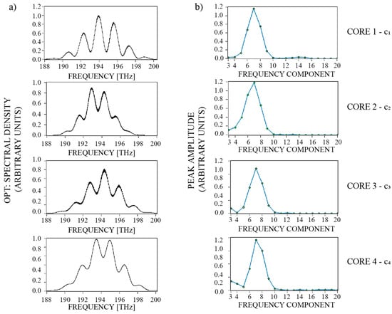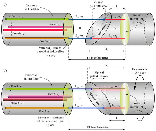 As already described in the previous section, the perpendicularly cleaved end of the in-line four core fiber (M1) and the in-line mirror (M2) define four FP interferometers. We assume that when no twist/rotation is applied to the sensor, core c1 is positioned against the shorter side of the asymmetrical microstructure h1, thus the light wave within the resonator trespasses the longest distance in the medium with the refractive index n1, and the shortest distance in the medium with the refractive index n2. Diametrically located core c3 is positioned against the longer side of the asymmetrical microstructure h2, therefore, the light wave travels the shortest distance in the medium with the refractive index n1, and the longest distance in the medium with the refractive index n2. The optical path lengths of interferometers defined by cores c2 and c4 are the same in this initial position. Exposing the sensor to twist/rotation alters the position of cores with respect to the angled plane of the asymmetrical microstructure. Rotation thus causes variation of optical path length in all four interferometers. For example, when the sensor is subjected to a 180-degree twist/rotation, diametrically positioned core c1 and core c3 interchange their positions, i.e., core c3 becomes positioned against the shorter side of the truncated cylinder h1, and core c1 is sited against the longer side of the truncated cylinder h2. Thus, the optical path length of the FP interferometer defined by the core c1 becomes longer than the optical path length of the interferometer defined by c3 (Figure 3b).