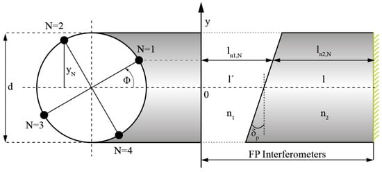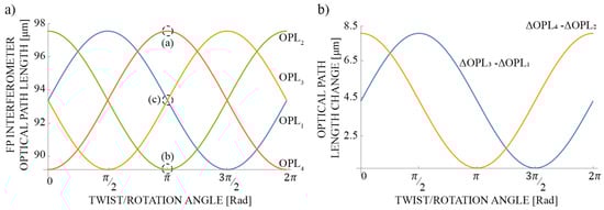 The optical path length of individual interferometers depends on the distance between fibers in the center of the structure l’, which also depends on strain and temperature. To obtain strain and temperature insensitive information on angle Φ, optical path length changes from two diametrically positioned FP-Interferometers (i.e., N = 1 and N = 3 or N = 2 and N = 4) can be further subtracted. By using Equations (1) and (5), twist/rotation angle from optical path length changes in FP-Interferometers N = 1 and N = 3 can be expressed as: