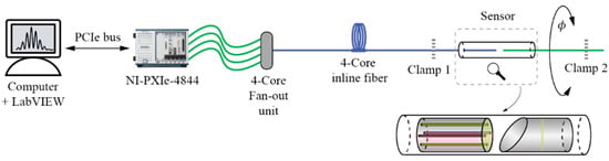 The experimental setup is illustrated in Figure 7. A special fan-out unit (FAN-4C, Fibercore) was used to couple light between the in-line four core fiber and four separate single core fibers, which were then connected to a four channel NI PXIe-4844 spectral interrogator. The sensor was fixed between two clamps. For measuring twist/rotation, a second clamp was mounted on a rotational stage with an angular resolution of 0.01°. For measuring elongation, the same clamp was attached to a linear stage with a resolution of 1 μm.