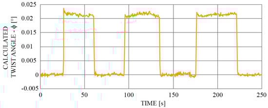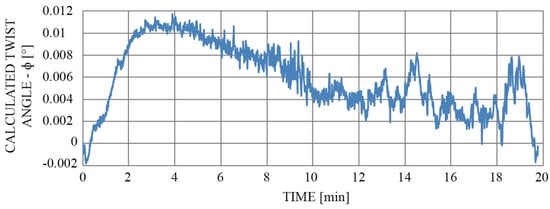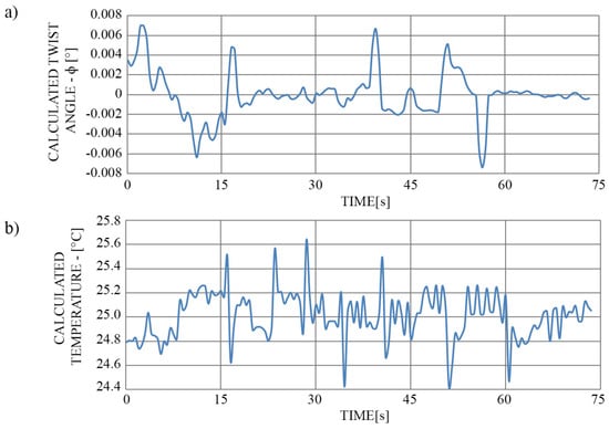 Figure 12 compares the actual temperature change with the proposed sensor’s response over time (the reference sensor was a PT100). Furthermore, we monitored the calculated twist/rotation angle change (Figure 13), which evolved during the same temperature cycle.