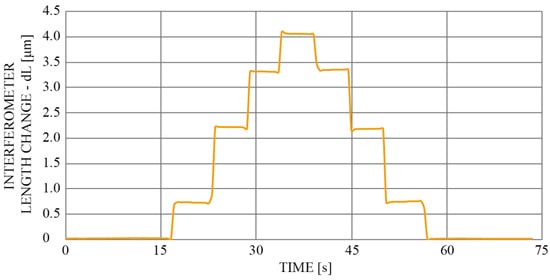 Furthermore, the sensor’s response was measured to the change of length (elongation). By “stretching” the sensor by 4 μm at 1 μm per step, and back to the initial position (Figure 10), the elongation was calculated by Equation (7).