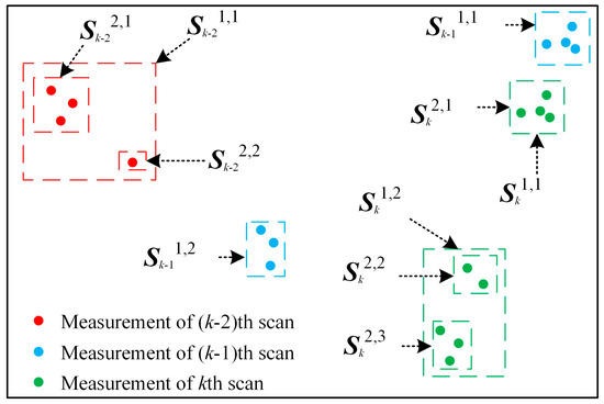 where zki,j,n means the n-th point in the j-th set under i-th partitioning distance in the k-th scan. Mki denotes the number of sets if the measurements are partitioned by the i-th distance in the k-th scan. Meanwhile, the quantity of partition in this scan is represented by Mk, it also means the quantity of partition distance. The alternative distance partitioning can be illustrated by Figure 1. The measurements of kth scan (green points) can be clustered into three sets with a small distance and two sets with a larger distance. The diagram in Figure 1 also infers that the quantity of alternative partitions Mk is alternative and determined by the spatial distribution of measurements.