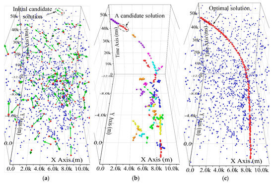 Meanwhile, the diagram of utilizing the GWO-TBD in a real scenario is presented in Figure 5. In Figure 5a,c, the measurements are represented by the blue points. The blue points are showcased in a 3-dimensional Cartesian coordinate system. Values of points on thhe x-y axes represent the location of the target, while the value of the third axis denotes the measuring time. In Figure 5a, the initial candidate solutions are represented by the green arrows, each of which is associating two measurement sets in different scans. The red point on the tail of the green arrows denotes the centroid of the measurement set which is used to form the initial tracklet.