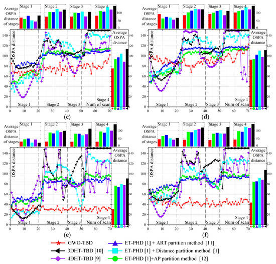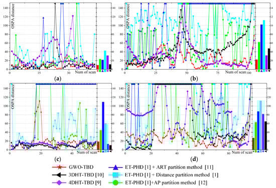 In this work, both the ET-PHD filter-based approaches and track-before-detect methods are compared with the GWO-TBD. In the category of PHD approaches, the distance partition method [], the ART partition method [] and the AP partition method [] are combined with the ET-PHD [] respectively. In the category of TBD approaches, the 3DHT-TBD [] and the 4DHT-TBD [] are used. Parameters, such as the false alarm rate, measurement rate, initial state of the extended target, are fed to the PHD filter before its iteration. The optimal sub-pattern assignment (OSPA) distance [] is used for evaluating the performance of the algorithms. The OSPA distance between the positions of n targets T = { T1, T2,…, Tn} and the estimated positions p = { p1, p2,…, pn} in each scan can be calculated by: