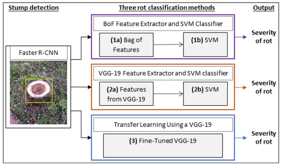 Stumps are detected using Faster-RCNN and sent to the rot classification, where three different methods have been evaluated. Two different SVMs (1b and 2b) are trained and tested sequentially based on the features extracted from Bag of Features (1a) and the FC-7 layer of an VGG-19 (2a) respectively. The third method is using a fine-tuned VGG-19 to both extract features and classify the rot. Each method outputs the severity of rot in the detected stump into one of three classes: rot = 0%, 0% < rot < 50% and rot ≥ 50%.