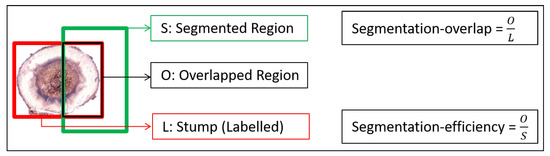 Segmentation in an object detection approach means dividing the image into foreground (object of interest) and background. Therefore, it is essential to evaluate the quality of the segmentation process. In this work, the segmentation quality shows how well the area of the detected object matches to the manually labeled object. We used two measures to estimate the segmentation quality: segmentation-overlap and segmentation-efficiency (see Figure 3) [39,40]. Segmentation-overlap is defined as the ratio between the overlapped region (O) and the manually labeled region (L), where overlap is the common area between the segmented region (S) and the manually labeled region (L). It demonstrates which percentage of the labeled area is actually segmented. For example, if segmentation-overlap is 0.6, then 60 % of the stump is also segmented. Segmentation-efficiency is defined as the ratio between the overlapped region (O) and the segmented area (S). It indicates how large part of the segmented area contains the actual object. For example, if segmentation-efficiency is 0.9, then 10% of the segmented area covers the background and 90% covers the stump.