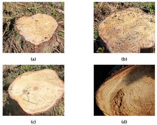 In forestry, the amount of site-specific information generated from various emerging and existing technologies is rapidly increasing. Timber harvesters store comprehensive forest information through the Standard for Forest machine Data and Communication (StanForD) recording system [7]. In principle, the StanForD data can be supplemented by operator inputs [8] or through additional machine-mounted sensors [9,10] to observe and record the surrounding environment in greater detail. Technological advancements are making it possible to estimate the actual position of the harvesting head and thus of the individual harvested tree with high precision [11]. Currently, harvesting machine operators visually detect the presence of RBR through a change in color of the sawdust ejected during the felling cut, after which they will move the crane boom in order to be able to make a visual assessment of the extent of rot before cutting the tree to various log assortments. However, timber harvester operators experience a high mental workload with up to 4000 control inputs per hour [12]. To derive objective and cost-effective measures, it would be beneficial to develop methods to automatically detect the presence of RBR from images taken at the time of felling. Machine vision is already gaining ground in forest operations by providing autonomous detection [13,14] and automating decision making with the aim of relieving the cognitive workload on the operators, e.g., [15]. A real-time detection of rot would further enable computer assisted qualitative bucking of logs to products.