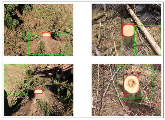 Comparing results of stump detector with the manually segmented stump. Red and green bounding boxes demonstrate manually segmented stump and result of stump detector, respectively.