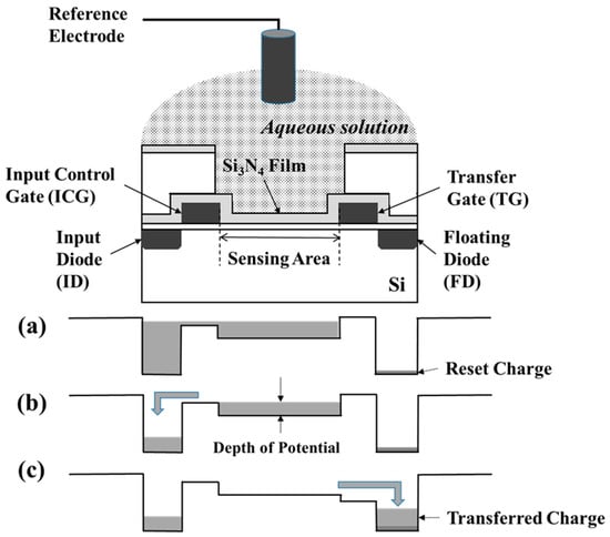 The sensor system using CMOS technology based on the previous block diagram of 128 × 128 sensor [14] was designed and fabricated. The main circuit design and pixel structure were the same. The present ion image sensor has four times more pixels than the 128 × 128 pixels sensor. Here, the basic sensing principle was briefly mentioned using Figure 1 with the cross-sectional view of a sensing pixel. The key is to be able to measure the surface membrane potential between the aqueous solution and the membrane or the Si3N4 film in Figure 1. Hydrogen ions adsorb and desorb onto the Si3N4, and affect the surface membrane potential in the sensing area. On the other hand, when Si3N4 was covered with a plasticized polyvinyl chloride (PVC) membrane including a cation selective ionophore, the cations adsorb and desorb onto the membrane, and change the surface membrane potential. Thus, their surface membranes depend on the concentration of the sensitive cations. The sensor chip has four terminals to process the charge. The input control gate (ICG) and transfer gate (TG) electrodes are used to control the potential level as the gating. The input diode (ID) and floating diffusion (FD) are pn junctions that supply the charge and detect the quantity of charge, respectively. With a decreasing ID potential, the charge exceeds over ICG, and is filled at the charge sensor area corresponding to the membrane potential, as shown in Figure 1a. With an increasing ID potential, the charge is spilled and holds, as shown in Figure 1b. With an increasing TG, the charge is transferred into FD, as shown in Figure 1c. The charge process can be repeated, and the charge is accumulated without noise. Therefore, the sensitivity is increasing, which is an excellent advantage for the CCD sensor.