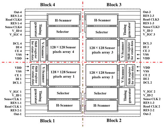 The structure of the sensor chip and the wiring on the package board is shown in Figure 2. In order to hold a compact size and use previous equipment, the sensor chip is divided into four blocks and each block has a timing generator, shift register, horizontal and vertical scanner, respectively. Each terminal with the same name except for CE is electrically connected on a package board.