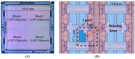 (A) A picture of the 256 × 256 array charged couple device (CCD)-type image sensor; (B) a micrograph of the sensor pixels.