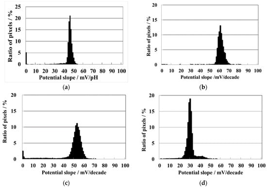 The potential response of each block to the corresponding cation was shown in Figure 5a–d. To measure the hydrogen ion sensitivity of the sensor, ordinal buffered pH standard solutions (pH 4, pH 7, and pH 9) were used. The numbers of the right upper block to pH sensing pixels was 16,384. The potential slope showed a distribution with an ideal high kurtosis. The maximum of the frequency distribution of the pH sensitivity was 46 mV/pH (48 mV/pH to pH 4–7, 43 mV/pH to pH 7–9). Although the slope is inferior to Nernstian response, most of the slopes indicated were highly sensitive. The other three blocks were treated with the ink-jet printing. The left upper block of the chip was printed with the sodium ion membrane, and the left under block with the calcium ion membrane, the right under block with the potassium ion membrane. The potential slope of sodium ion block is high and the maximum distribution was 61 [mV/decade] (63 mV/decade to 0.4 mM–4 mM, 60 mV/decade to 4 mM–40 mM) that were almost Nernstian response, as shown in Figure 5b. The frequency distribution has a high kurtosis with a deviation to high value. The potential slope of the potassium ion block is lower than that of the sodium ion block, as shown in Figure 5c. The maximum distribution potential slope was 52 [mV/decade] (53 mV/decade to 2 mM–20 mM, 51 mV/decade to pH 20 mM–200 mM), and has a wide normal distribution. Although many potential responses did not achieve Nernstian slope, the sensitivity was higher than the pH block. The potential slope of calcium ion block is lower than the other cation, as shown in Figure 5d. The lower sensitivity was due to the ion valence of +2. The maximum distribution potential slope was 29.0 [mV/decade] (26 mV/decade to 0.18 mM–1.8 mM, 32 mV/decade to 1.8 mM–18 mM) that was Nernstian slope. The frequency distribution has a high kurtosis and a slight distribution with a small deviation to high value. These potential slopes were not ideal, however, the response was close to Nernstian response or sufficient response.