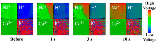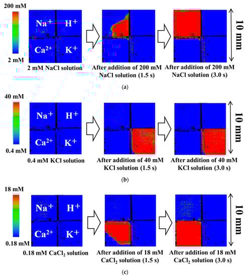Snapshots of the multi-ion image sensor are shown in Figure 6. When 400 µL of the 200 mM sodium ion solution was added into 400 µL of 2 mM sodium ion solution by a 1000 µL pipette, the color of the left upper block immediately changed from blue to red (Figure 6a). The left upper block responded to the concentration change of sodium ions, but no change appeared in the other block, except for slight areas at the upper edge of calcium ion block and the right edge of potassium ion block. When the sodium membrane was prepared by the ink-jet method, it seemed that the sodium membrane painting solution was leaked to these areas. When 400 µL of the 0.18 mM calcium ion solution was added into 400 µL of 18 mM calcium ion solution by a 1000 µL pipette, the color of the left under block immediately changed from blue to red (Figure 6b). The left under block responded to the concentration change of calcium ions, but no change appeared in the other block. When 400 µL of the 0.4 mM potassium ion solution was added into 400 µL of 40 mM potassium ion solution by a 1000 µL pipette, the color of the right under block immediately changed from blue to red (Figure 6c). The right under block responded to the concentration change of potassium ions, but no change appeared in the other block, except for the sodium ion block. The sodium ion block had a slightly potential response to calcium ion concentration. All the concentration changes were completed in three s. For all additions of the pipette, the pH region of the upper right did not show a concentration change. This is very effective to selectively detect ion behaviors based on cell functions without considering pH variation.