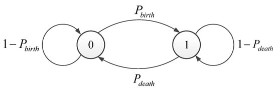 - Calculation of mixing probabilitiesThe mixing probability of birth density is calculated bySimilarly, the mixing probability of continuing density is calculated byThen, the normalized mixing probabilities can be expressed by