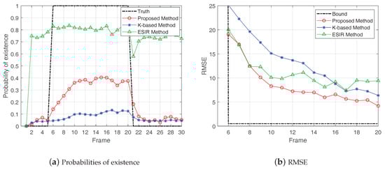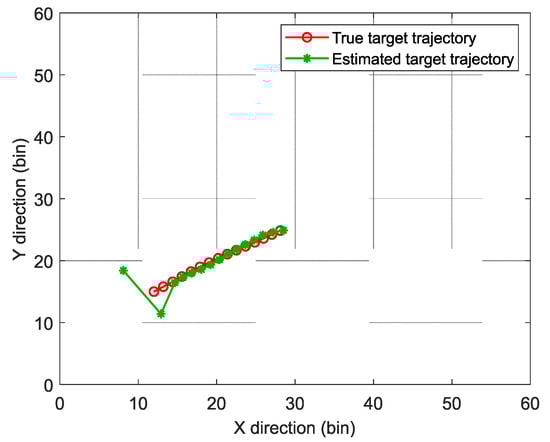 - Estimation of target stateThe detection threshold of existence is assumed as . When , the hypothesis of target existence is accepted and the target state will be estimated by