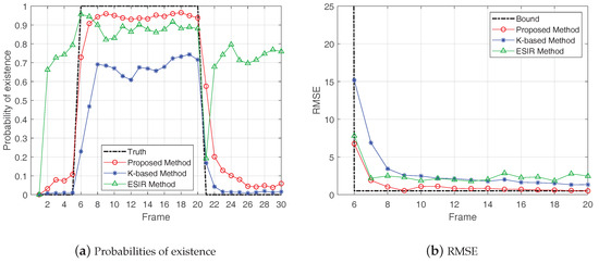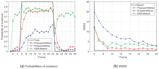 - Root Mean Squared Error (RMSE) of Estimated PositionThe RMSE is calculated bywhere M is the number of Monte Carlo experiments, and and denote the estimated position and true position of the target in the ith Monte Carlo experiment, respectively.