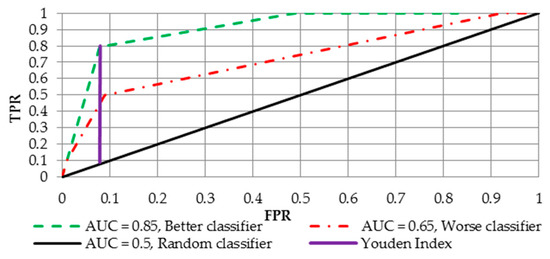 Since the ROC is considered to be the best global measure assessing the effectiveness of a model, it is a good starting point for searching for an optimal cutoff point. To benefit from the optimal score threshold, Youden’s statistic [49] was employed. The optimal cutoff is defined as (see the purple line in Figure 1):