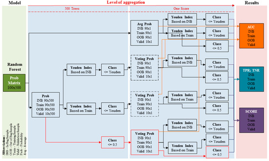 After the RF is built, every computer implementation (packages like randomForest or ranger in R environment) returns both a matrix with an estimated probability for each observation and a tree within the forest, and a matrix that indices whether a particular observation was in the In Bag (1 flag) or the OOB (0 flag) sample for a particular tree. After combining the information in these matrixes, the estimated probability for a particular observation can be determined in four different ways (Figure 2): (1) averaging (Avg Prob table); (2) majority class voting, where the cutoff for class determining is derived based on the In Bag sample (dashed Voting Prob table); (3) majority class voting, where the cutoff for class determining is derived based on the training sample (dotted-dashed Voting Prob table); and (4) majority class voting, where the cutoff is set to 0.5 (red Voting Prob table). For the sake of this example, assume that an entire dataset that includes 100 observations is divided into a training sample (90 observations) and a validation sample (10 observations). Also assume that the RF includes 500 trees, which means that the analyzed matrix is 100 × 500.
