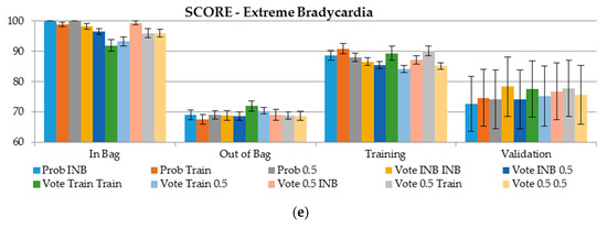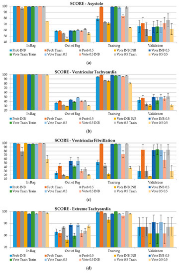 The estimates for the performance measures for the training and validation samples were produced with -fold cross-validation. The number of sets was set to 10 when there were more than 10 samples in the smaller class. Otherwise, was set to the size of the smaller class to ensure that there was at least one sample from both of the classes (9 for extreme tachycardia and 6 for ventricular fibrillation or flutter). The sets were generated so that the class distribution in every set represented the class distribution of the entire dataset using stratified sampling based on the createFolds function implemented in the caret library [57]. All further results are presented as an average over k-folds with the standard errors of the estimates.