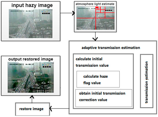 The process of haze removal for every frame of a traffic video can be divided into three steps: calculating atmospheric light, estimating the transmission map, and restoring the image. In this paper, we present a novel adaptive method for transmission map estimation, thus the dehazing algorithm can be applied to images with different degrees of haze. The framework of the single-image dehazing algorithm is shown in Figure 1.