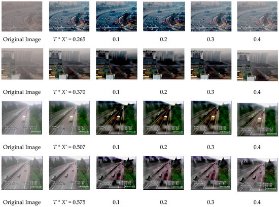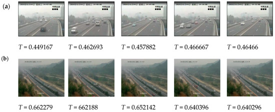 The structural similarity (SSIM) index is a method for predicting the perceived quality of digital television and cinematic pictures, as well as other kinds of digital images and videos. To guarantee that the restored images are closer to ground truths, we adopted the SSIM index [29] to measure the similarity between the ground truths and restored images. Because the traffic video is captured by a fixed camera, we can get a haze-free image of the same scene as a reference image in advance and compare the restored image with the reference image. The initial value of can be obtained directly because it is relevant to the nature of images, whereas the unknown value is calculated by the SSIM. In our experiments, we set as a series of values between 0.3 and 1.2, and the interval is 0.02. Then, we take every in this range multiplied by T, that is, , as the initial value of transmission and get the corresponding restored image. At last, we find a restored image that is closest to the haze-free image based on the maximum value of the SSIM index. Thus, the value of transmission is the optimal initial value, and the corresponding correction value is the optimal correction value of initial transmission.