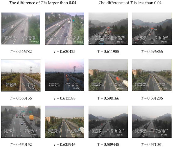 Because the cameras are fixed, the scenes in traffic videos barely change over a long period of time, and the influence of haze is stable. In our experiments, we use the traffic videos from ZhongHe elevated freeways in Hangzhou City, set a cycle of five minutes, and regard the frames in one cycle as a collection of images with the same characteristics. Figure 3 shows images whose interval is 1 min in a 5 min cycle, and the difference of is very small, usually less than 0.04. Figure 4 presents the difference in restored images by using different values where the results have no obvious influence on visibility with the difference of less than 0.04. Therefore, if the videos are captured at the same scene, the values of for these video images in a 5 min cycle are at the same level, and the cycle of 5 min is reasonable in practical application.